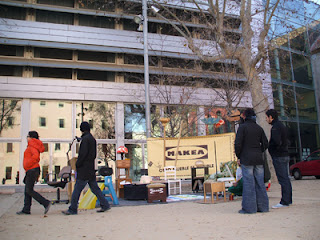 Dentro del deambular por las calles, pasillos del gran laberinto, de estas nuestras ciudades... del dejarte fluir por la sensación de encontrar tu objetivo, una nueva sensacion que sentir,un tesoro por descubrir... y al mismo tiempo, ser conscientes, de la crudeza de la situación actual que vivimos, por una parte las imagenes y sensaciones de felicidad aparente que nos vende este espectáculo y por otra la imagen real y cruda de la realidad precaria, esa de las deficencias sociales y de los sobrantes materiales. A pesar de la situación, nuestras ganas de jugar a pensar, no se pasan,...y entonces empezamos a actuar en la calle, pasando a marcar y colocar en escena todos aquellos muebles o deshechos útiles de reutilización que se van cruzando en nuestro recorrido.